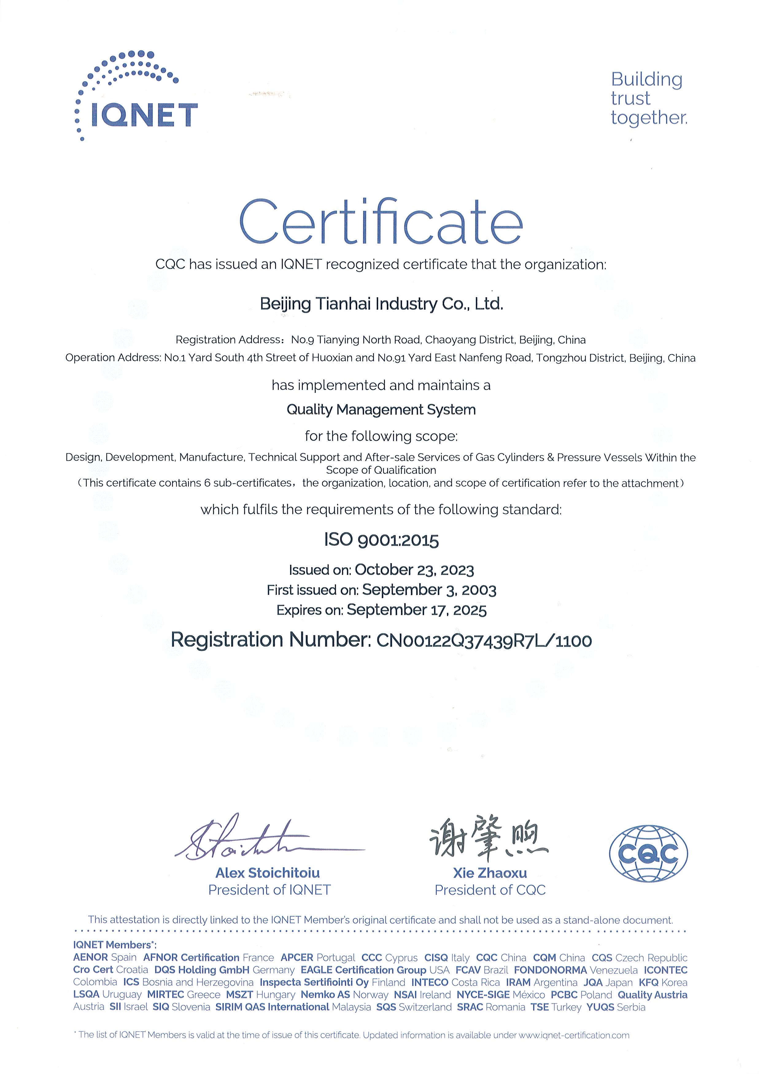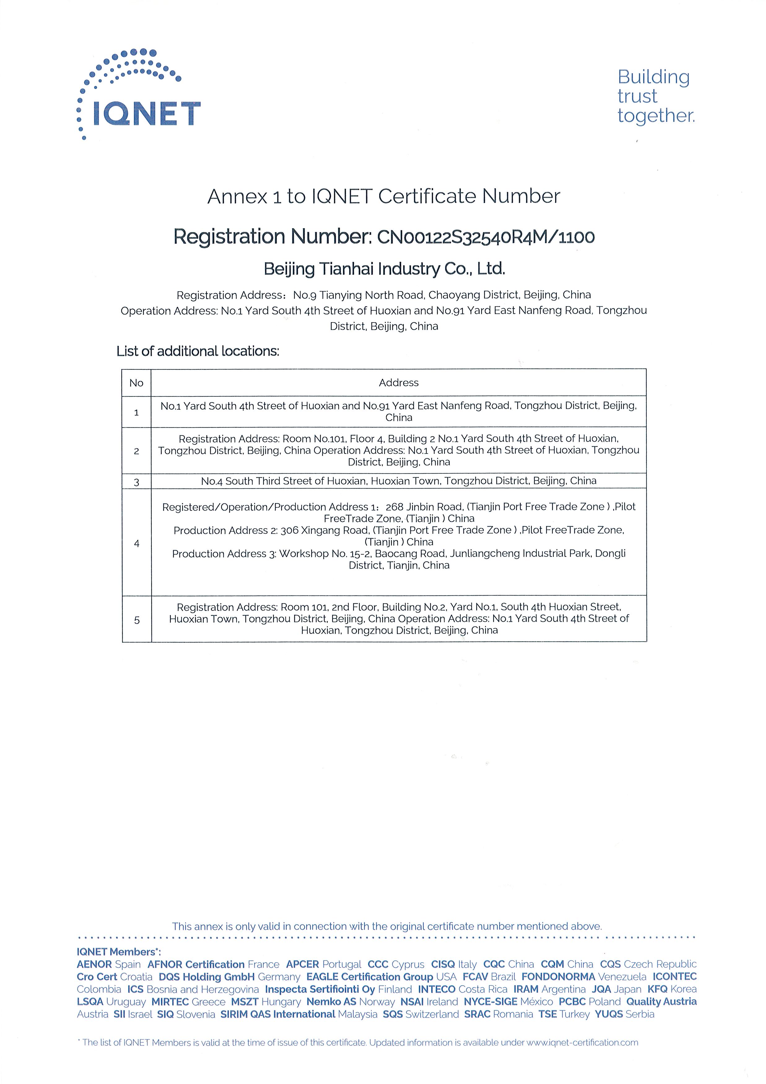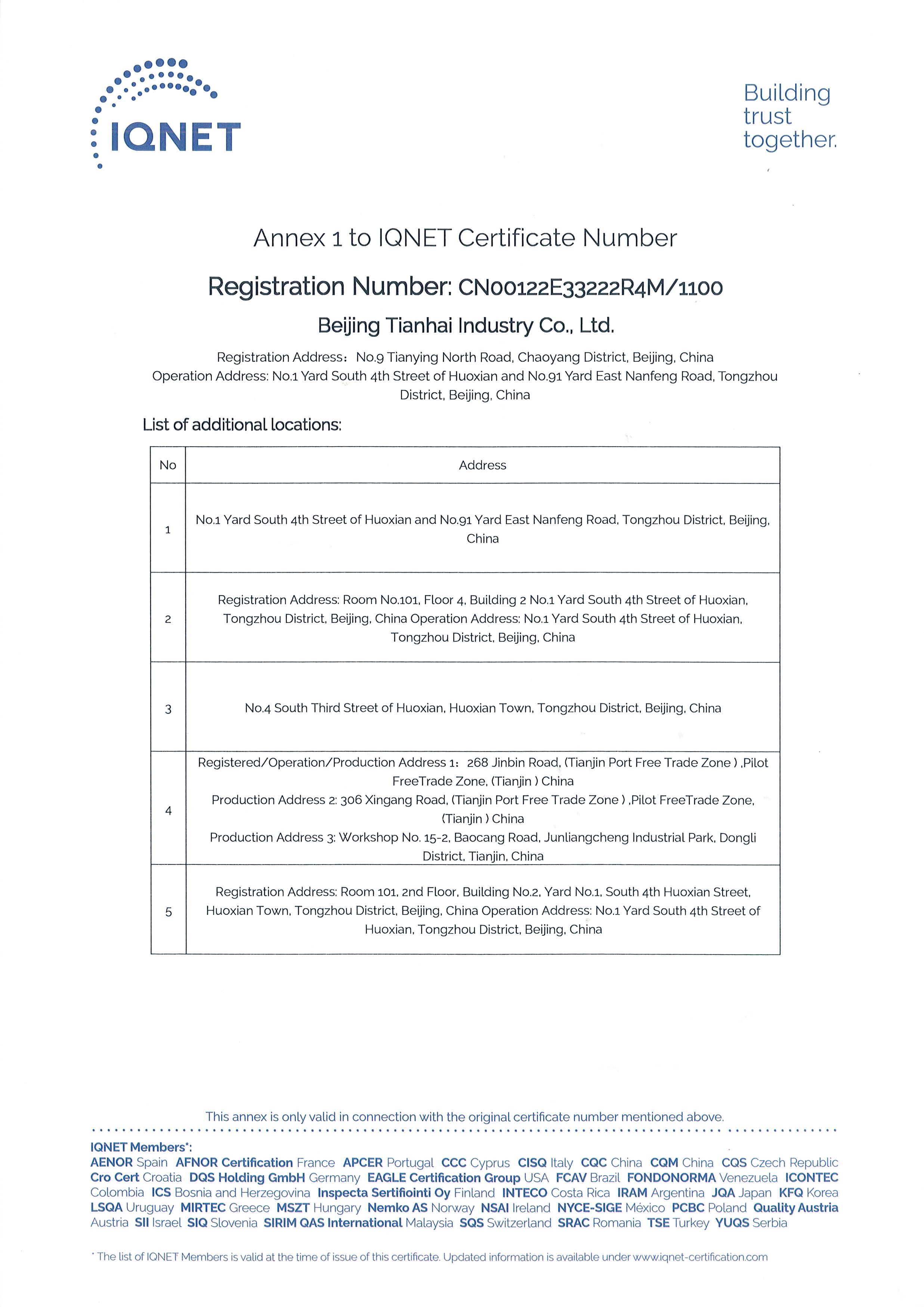 2010年9月,天海工業(yè)為保證品牌質(zhì)量,保證產(chǎn)品一致性,建立了集團(tuán)一體化ISO9001質(zhì)量管理體系,通過中國質(zhì)量認(rèn)證中心的集團(tuán)式認(rèn)證并取得證書。
