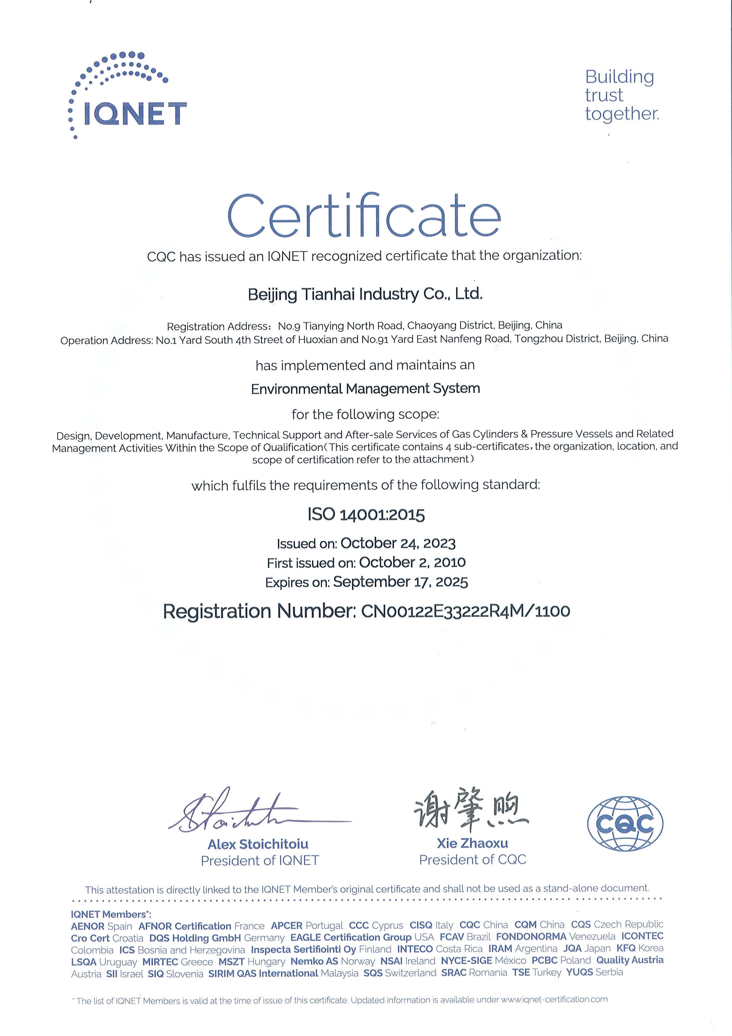 2010年-2015年,天海工業(yè)陸續(xù)建立了ISO14001和OHSAS18001環(huán)境和職業(yè)健康安全管理體系,整合了天海工業(yè)“三體系”,通過中國質(zhì)量認(rèn)證中心的認(rèn)證并取得證書。